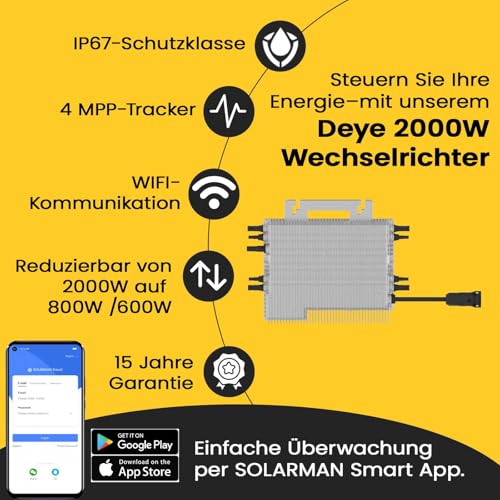 - Bis zu 2000 VA Leistung dank des Deye SUN-M200G4-EU-Q0 Wechselrichters