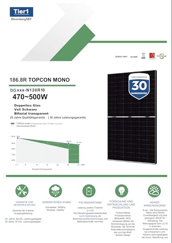 Der mitgelieferte Deye Wechselrichter wandelt den erzeugten Gleichstrom in Wechselstrom um, den Du direkt in Dein Hausnetz einspeisen kannst. Durch die integrierte WIFI-Funktion kannst Du die Leistung Deiner Anlage überwachen. Das Komplettset enthält außerdem ein 5m Anschlusskabel mit Wielandstecker und DEYE Verbinder sowie Verlängerungskabel mit MC4 Solarsteckern, um eine einfache und sichere Installation zu gewährleisten. Die Solarmodule sind robust gebaut und widerstehen starken Winden und hohen Schneelasten. Sie sind zudem TÜV-zertifiziert und PID-resistent.