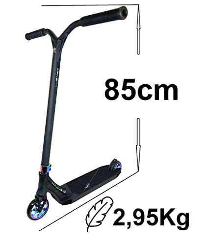 Der Ethic Erawan V2 ist ein kompletter Stunt-Scooter, der speziell für den professionellen Freestyle-Einsatz entwickelt wurde. Er richtet sich an geübte Fahrer, die Wert auf Performance und Haltbarkeit legen. Mit einer Gesamthöhe von 86cm ist er für Fahrer geeignet, bei denen die Lenkerhöhe idealerweise der Hüftknochenhöhe entspricht. Ein wichtiges Merkmal dieses Scooters ist sein extrem geringes Gewicht von nur 2,95 kg, was ihn besonders agil und wendig macht.