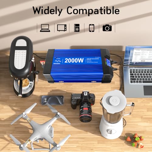 Der ETREPOW 2000W Reiner Sinus Wechselrichter wandelt 12V Gleichstrom in 220V/230V Wechselstrom um. Er bietet eine Dauerleistung von 2000W und eine Spitzenleistung von 4000W. Damit kannst du eine Vielzahl von Geräten betreiben, von alltäglichen Kleingeräten bis hin zu professionellen Werkzeugen. Er ist kompatibel mit Mobiltelefonen, Computern, Toastern, Waschmaschinen, Kaffeemaschinen, Schneidemaschinen und vielem mehr.