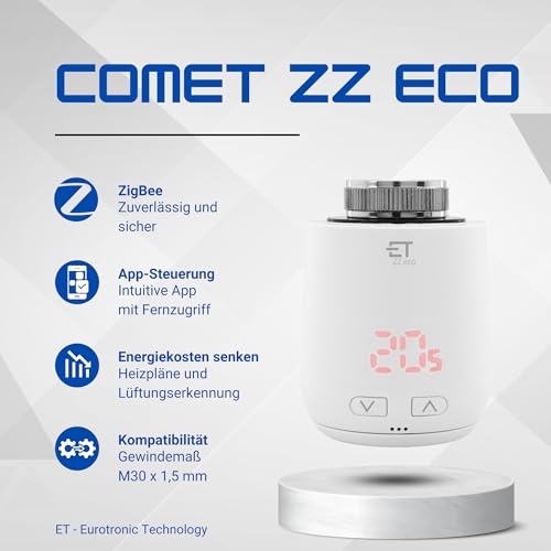 Mit dem Eurotronic Comet ZZ eco Set profitierst du von einer intelligenten und komfortablen Heizungssteuerung. Du kannst deine Heizkosten um bis zu 30% senken, indem du individuelle Zeitpläne erstellst und die Temperatur an deine Bedürfnisse anpasst. Die App-Steuerung ermöglicht dir eine einfache und intuitive Bedienung, egal wo du dich gerade befindest. Dank der zuverlässigen ZigBee-Funktechnologie und der praktischen Komfortfunktionen wie Lüftungserkennung und Frostschutz ist dein Zuhause immer optimal temperiert.