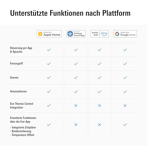- Ja, für die Nutzung des Eve Thermo ist eine Steuerzentrale der von dir gewählten Plattform (Apple Home, Samsung SmartThings, Amazon Alexa, Google Home) erforderlich.