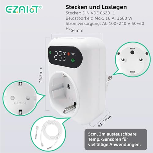 Fragen und Antworten zu ezAIoT WLAN Steckdosen-Thermostat mit Zeitschaltuhr für Heizung und Kühlung – Digitaler Temperaturregler mit 3m Fühler für Gewächshäuser und Aquarien, 230V, LED Bildschirm