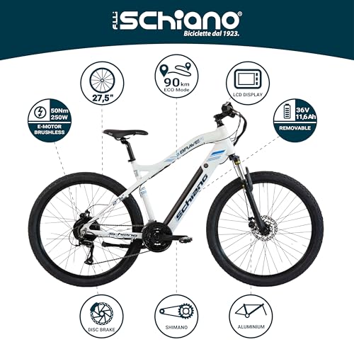 Fragen und Antworten zu F.lli Schiano Braver, E Bike Mountainbike, 27.5 Zoll, 36V 11.6Ah Abnehmbarer Akku, Motor 250W 50Nm, MTB Ebike für Herren/Damen, Weiß