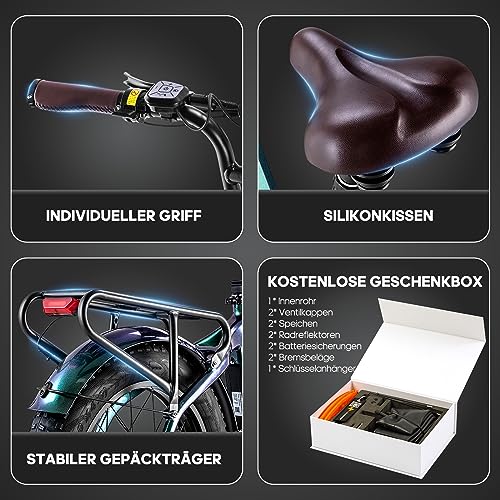 Ein besonderes Merkmal ist der Carbonfaserrahmen, der das E-Bike leichter macht und gleichzeitig die Dämpfung verbessert. Das bedeutet, dass Stöße und Vibrationen während der Fahrt reduziert werden, was den Komfort erhöht. Für deine Sicherheit sorgen die hydraulischen Scheibenbremsen, die schnell reagieren und eine gute Kontrolle gewährleisten. Der starke Nabenmotor mit einem Drehmoment von 60N.m unterstützt dich auch bei Steigungen. Die 20*4,0 Zoll Fettreifen bieten erhöhte Reibung und passen sich verschiedenen Untergründen wie Schnee, Sand, Schlamm und Schotterstraßen an.