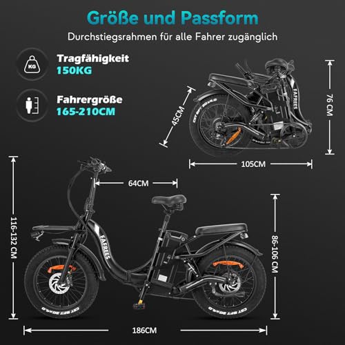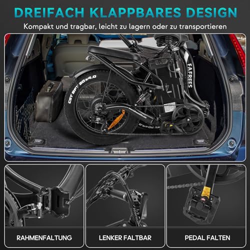 Fragen und Antworten zu Fafrees F20 X-MAX E Bike Elektrofahrräder 20 Zoll, Ebike Herren 48V 30Ah Akku, Reichweite 120-200km, 4.0 Fat Tire Klapprad E-Bike, 65 N.m Motor E Fahrrad Damen Lastkapazität 150 kg, Schwarz