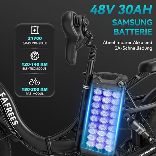 Das Fafrees F20 X-MAX ist ein E-Bike, das dir dank seines 48V 30Ah Akkus mit Samsung-Zellen eine beachtliche Reichweite bietet. Laut Produktbeschreibung sind bis zu 140 Kilometer mit einer einzigen Ladung möglich. Im Tretunterstützungsmodus (PAS) kann die Reichweite sogar auf 180–200 km erhöht werden. Der Akku ist leicht entnehmbar und verfügt über eine Schnellladefunktion.