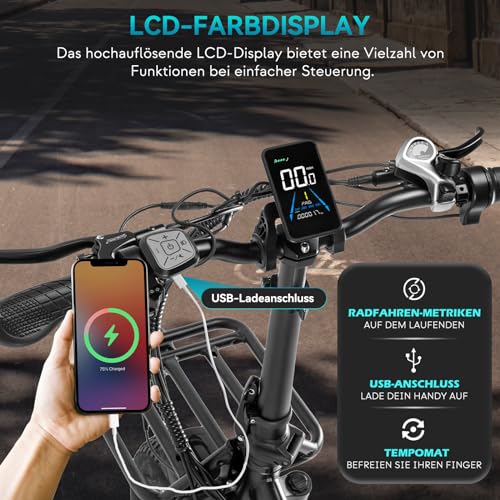 Für deine Sicherheit ist das E-Bike mit Vorder- und Rücklichtern sowie Blinkern ausgestattet. Das LCD-Farbdisplay informiert dich über wichtige Fahrdaten wie Geschwindigkeit, Akkustand und Kilometerstand. Über den integrierten USB-Anschluss kannst du dein Smartphone während der Fahrt aufladen. Dank der mitgelieferten Installationsanleitung soll die Montage des E-Bikes einfach sein.