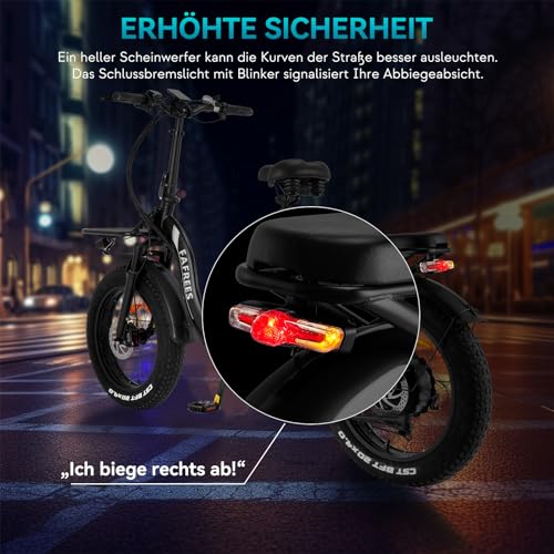 Mit dem Fafrees F20 X-MAX E-Bike kannst du deine täglichen Wege umweltfreundlich und komfortabel zurücklegen. Der leistungsstarke Akku ermöglicht es dir, auch längere Strecken ohne Probleme zu bewältigen, während die Federung und die Fat Tires für ein angenehmes Fahrgefühl sorgen. Die integrierten Lichter und Blinker erhöhen deine Sicherheit im Straßenverkehr. Das klappbare Design erleichtert den Transport und die Lagerung des E-Bikes.