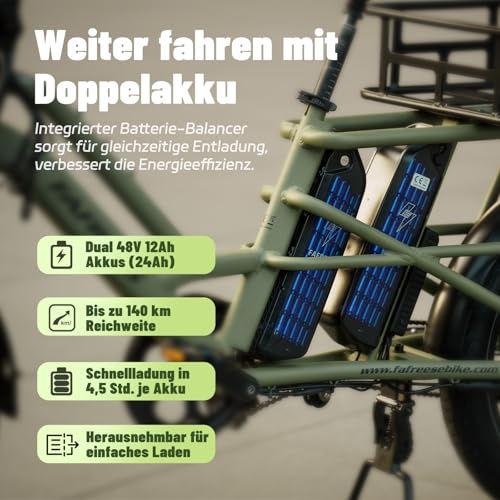 Im Vergleich zu anderen E-Bikes in der Kategorie Lastenrad zeichnet sich das Fafrees Longtail E-Bike durch seine hohe Tragfähigkeit und die doppelten Akkus aus, die eine überdurchschnittliche Reichweite ermöglichen. Während viele andere Modelle auf einen einzelnen Akku oder eine geringere Zuladung beschränkt sind, bietet dieses E-Bike mehr Flexibilität und Komfort im Alltag. Auch das modulare Design, das eine individuelle Anpassung an die Bedürfnisse des Nutzers ermöglicht, ist ein Alleinstellungsmerkmal.