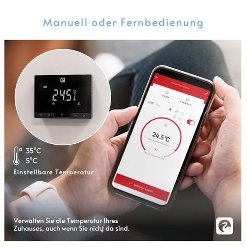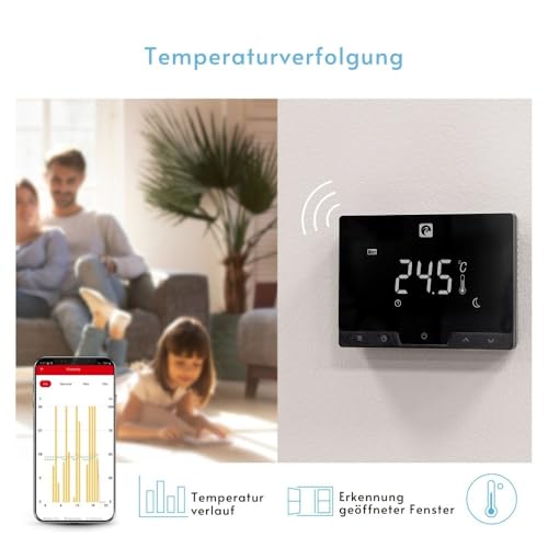 Die Bedienung des Thermostats ist denkbar einfach. Dank des Touchscreens lassen sich alle Einstellungen intuitiv vornehmen. Alternativ kannst du das Thermostat auch per App von deinem Smartphone oder Tablet aus steuern. Die Kompatibilität mit Alexa und Google Assistant ermöglicht sogar die bequeme Sprachsteuerung. Der einstellbare Temperaturbereich liegt zwischen 5 °C und 35 °C. Zudem verfügt das Thermostat über eine Frostschutzfunktion und eine Fenster-Öffnen-Funktion, die zusätzlich Energie sparen.