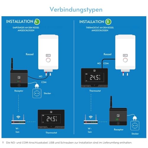 Fragen und Antworten zu Garza – Wireless Wifi Smart Thermostat für Kessel und Heizung, programmierbar, Touchscreen, Wifi 2.4GHz, Fernsteuerung per App und Alexa/Google Voice, Farbe Schwarz