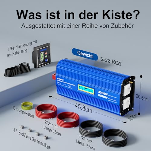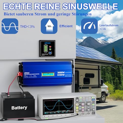 Produktbeschreibung: GIANDEL 3000W Reiner Sinus Wechselrichter 12V auf 230V Spitzenleistung 6100W Spannungswandler Kompatibel mit LiFePO4 Power Inverter mit Fernbedienung und USB-C PD 30W für Wohnmobil Camping Wohnwagen