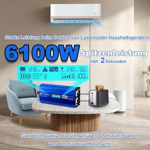 - 3000W kontinuierliche Leistung mit einer Spitzenleistung von 6100W für kurzzeitige Lasten.