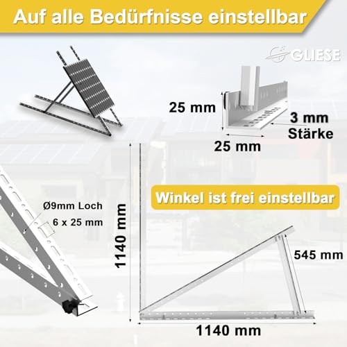 Produktbeschreibung: GLIESE Solarmodul Halterung 114 cm (2 Sets), Aluminiumlegierung Solarpanel Halterung,Balkonkraftwerk Halterungen ,PV-Module Halterung Solarmodul für 100W-600W,Verstellbarer Winkel Von 0°-90°,0% MwSt