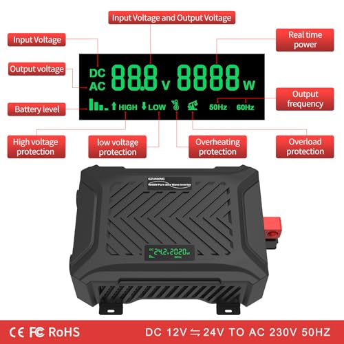 Produktbeschreibung: GZUNKNG Dual Voltage Wechselrichter 12V/24V auf 230V Reiner Sinus Universal Dualer Spannungswandler 2000W/2000W, Automatische intelligente Erkennung von 12V/24V, Spitzenleistung 4000W/4000W.