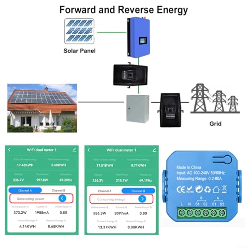 Ein besonderes Merkmal des Smartmeters ist die Möglichkeit, die Leistung sowohl in Vorwärts- als auch in Rückwärtsrichtung zu messen. Dies ist besonders nützlich, wenn du beispielsweise eine Photovoltaikanlage besitzt und Energie ins Netz einspeist. Der Smartmeter ermöglicht es dir außerdem, zwei Kanäle (A und B) unabhängig voneinander zu überwachen. Das ist ideal, wenn du den Energieverbrauch verschiedener Geräte oder Bereiche in deinem Haushalt separat analysieren möchtest.