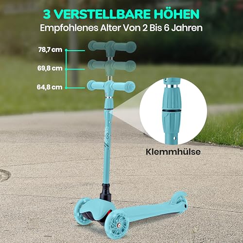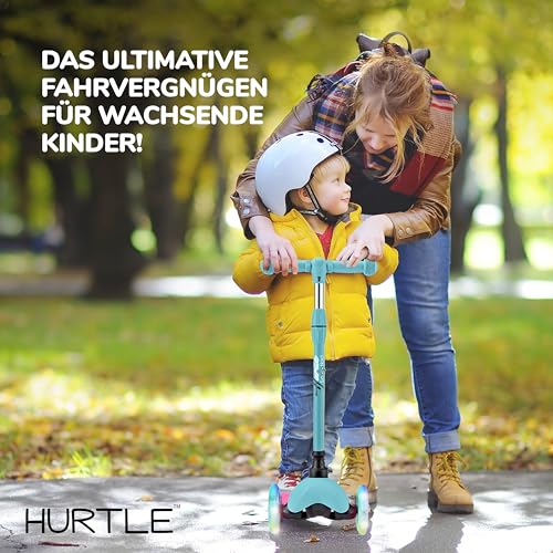 Fragen und Antworten zu Hurtle Mini Kickboard Scooter für Kinder – Höhenverstellbar 63,5 cm – 71,1 cm, Leichter 3-Rad Roller mit LED Leuchträdern, rutschfest, für Kinder von 2-5 Jahren (Türkisblau)