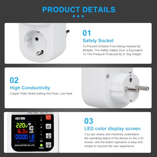 Produktbeschreibung: Jadeshay Stromzähler für Steckdose, WLAN Steckdose Strommessgerät Steckdose Energiekostenmessgerät Wattmeter mit Farbdisplay, Einstellbare Spannung Strom Leckageschutzgerät 16A 230VAC