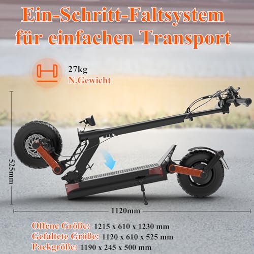 - Der E-Scooter ist mit einem hydraulischen Bremssystem und Stoßdämpfern ausgestattet, was für eine hohe Sicherheit sorgt.