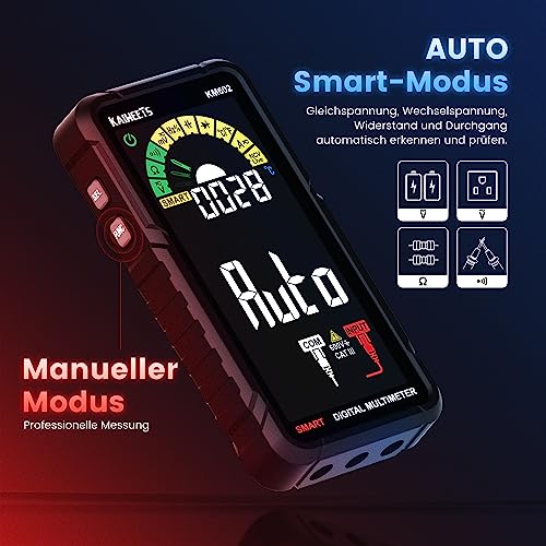 Im Vergleich zu anderen Multimetern in dieser Kategorie zeichnet sich das KAIWEETS KM602 besonders durch seinen intelligenten Modus und den wiederaufladbaren Akku aus. Während viele andere Geräte auf herkömmliche Batterien angewiesen sind, bietet das KM602 den Komfort eines integrierten Akkus. Der Smart-Modus vereinfacht die Bedienung erheblich, da er die Messart automatisch erkennt und somit Fehlbedienungen reduziert. Viele Multimeter konzentrieren sich auf bestimmte Messbereiche, das KM602 bietet einen breiten Funktionsumfang und ist somit ein echter Allrounder für verschiedene Anwendungen.