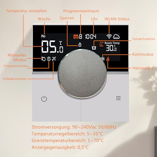 - Das Thermostat kann auch im manuellen Modus ohne WLAN genutzt werden, jedoch stehen dann die intelligenten Funktionen wie App-Steuerung und Sprachbefehle nicht zur Verfügung.