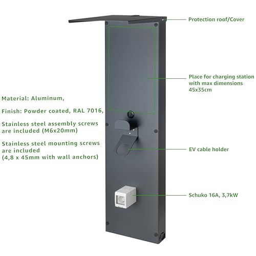 Zusätzlich verfügt die Säule über eine Schuko-Steckdose mit einer maximalen Belastung von 16A (3,7kW) sowie einen praktischen Ladekabelhalter. Die Wandsäule selbst ist aus robustem Aluminium gefertigt und in der eleganten Anthrazit-Farbe RAL7016 gehalten. Die Lieferung umfasst Edelstahlschrauben für die Montage.