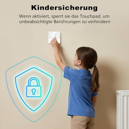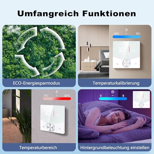 Der Thermostat ist für die Unterputzmontage konzipiert und kompatibel mit 86 x 86 mm Standard-Abzweigdosen oder 60 mm europäischen Abzweigdosen. Zusätzliche Funktionen wie die Kindersicherung, die Helligkeitseinstellung der Hintergrundbeleuchtung und der Schutz vor hohen/niedrigen Temperaturen bieten zusätzlichen Komfort und Sicherheit. Du kannst zwischen einem automatischen und einem manuellen Modus wählen, je nach Deinen individuellen Bedürfnissen. Bei Fragen steht Dir ein Premium-Service per E-Mail zur Verfügung, der innerhalb von 24 Stunden antwortet.