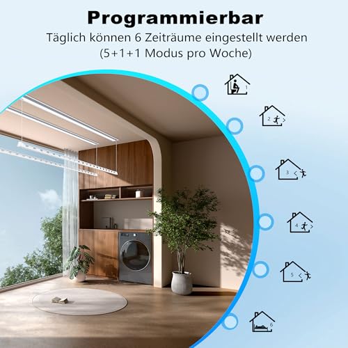 - Nutze das programmierbare Wochenprogramm, um Energie zu sparen.