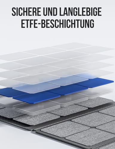 Das robuste Design des LiTHELi Solarmoduls sorgt für eine lange Lebensdauer. Das ETFE-laminierte Gehäuse schützt die Solarzellen vor äußeren Einflüssen, und die IP65-Wasserschutzklasse macht das Modul widerstandsfähig gegen Wasser und Dampf. Du kannst das Solarmodul also problemlos auch bei wechselhaftem Wetter nutzen. Der integrierte, einfache Ständer ermöglicht es dir, das Panel schnell und unkompliziert aufzustellen und optimal zur Sonne auszurichten. Mit einem Gewicht von nur 5,4 kg und dem faltbaren Design lässt sich das Solarmodul zudem leicht transportieren und verstauen.