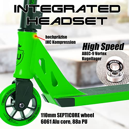 Produktbeschreibung: Longway Stunt Scooter – Summit – High End Profi StuntScooter, 6061 T6 Alu, ABEC 9 Kugellager, 110mm Wheels mit Alu Core, kickscooter, Funscooter, Roller, Trick Scooter für Kids, Teens und Pros, Grün