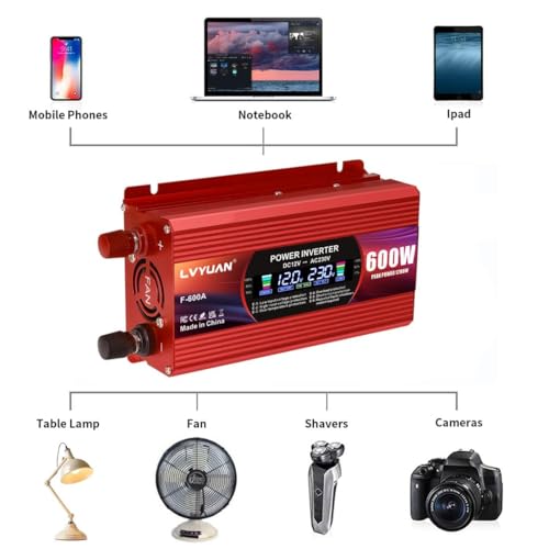 Mit dem LVYUAN 600W/1200W Wechselrichter verwandelst du 12V Gleichstrom aus deinem Auto, Wohnwagen oder LKW in 230V Wechselstrom. So kannst du unterwegs deine elektronischen Geräte wie Handys, Laptops oder Ventilatoren problemlos nutzen. Der integrierte LCD-Bildschirm zeigt dir dabei wichtige Informationen über den aktuellen Betriebszustand an, während das intelligente Schutzsystem für deine Sicherheit sorgt.
