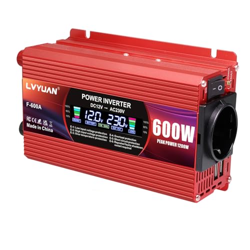 Produktbeschreibung: LVYUAN 600W/1200W Wechselrichter DC 12V auf AC 230V Spannungswandler 1 EU Steckdose & 2 USB Port Stromwandler Inverter für Auto KFZ Wohnwagen LKW