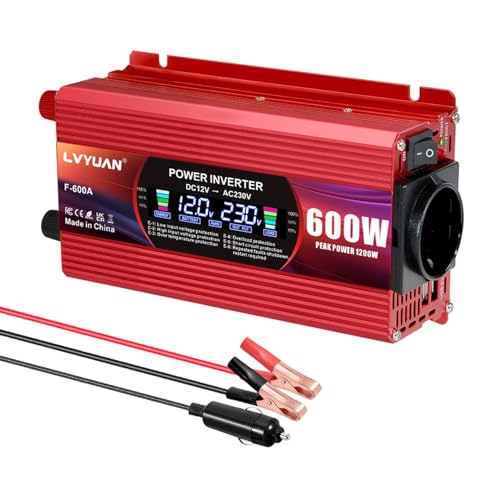 Fragen und Antworten zu LVYUAN 600W/1200W Wechselrichter DC 12V auf AC 230V Spannungswandler 1 EU Steckdose & 2 USB Port Stromwandler Inverter für Auto KFZ Wohnwagen LKW