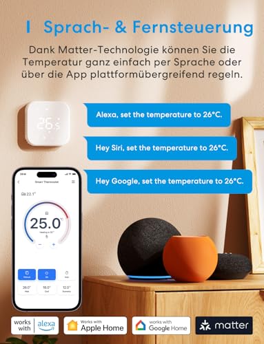 - Der Thermostat ist kompatibel mit Matter, Apple HomeKit, Alexa, Echo, Echo Dot, Google Assistant und Google Home.