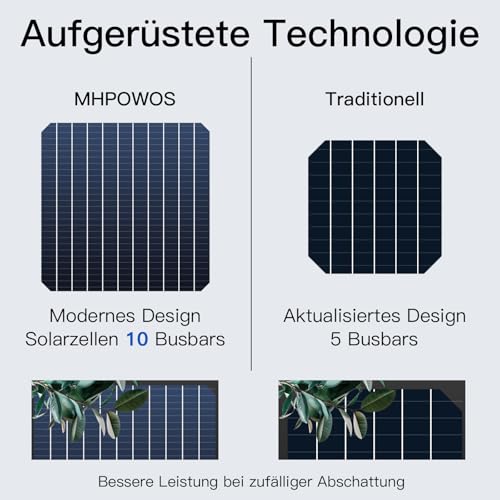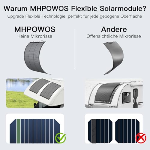 Im Vergleich zu herkömmlichen starren Solarmodulen zeichnet sich das MHPOWOS 100W flexible Solarmodul durch seine Flexibilität und das geringe Gewicht aus. Während starre Module oft schwer und unhandlich sind, lässt sich dieses flexible Modul leichter transportieren und auf verschiedenen Oberflächen montieren. Zudem ist es dank der ETFE-Oberfläche widerstandsfähiger gegen Witterungseinflüsse. Andere flexible Solarmodule mögen ähnliche Eigenschaften aufweisen, aber die Kombination aus hoher Effizienz und Wasserdichtigkeit macht dieses Modul zu einer attraktiven Option.