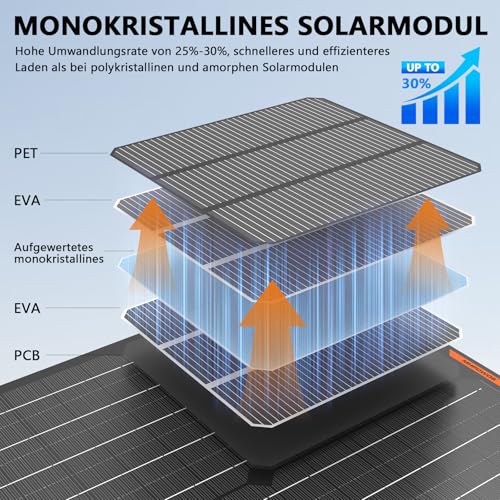 - Hoher Umwandlungswirkungsgrad durch monokristalline Zellen