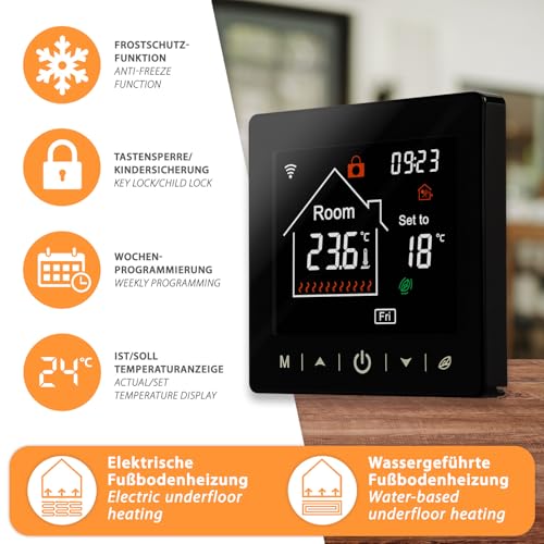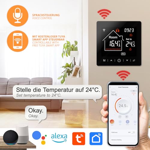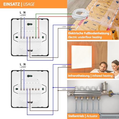 - Das Thermostat ist ideal für elektrische Heizfolie, Dünnbettheizmatte und andere elektrische Heizsysteme geeignet. Bei Wasserheizungen hängt die Kompatibilität von den verwendeten Stellantrieben ab.