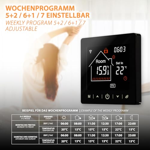- Individuelle Wochenprogrammierung zur Optimierung der Heizzeiten.
