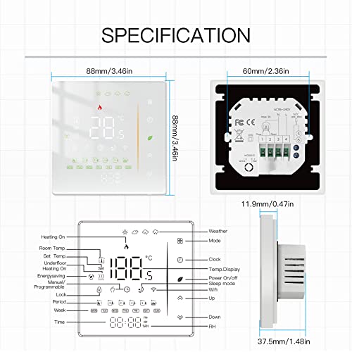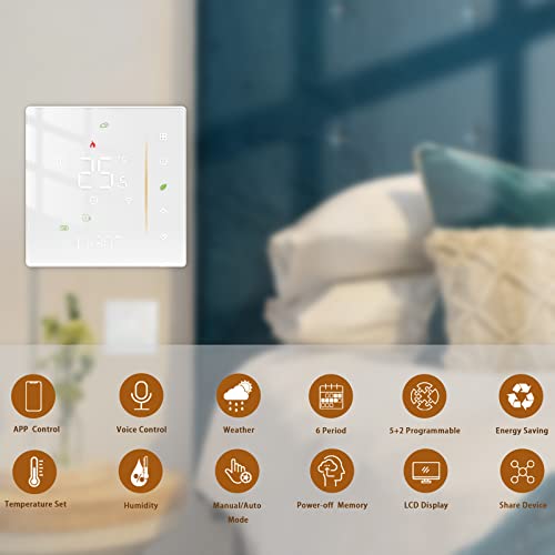Die Steuerung des Thermostats erfolgt über ein rahmenloses Touch-Display mit einem 2.5D-Bogeneffekt. Du kannst die Temperatur aber auch bequem per Smartphone-App (Tuya/Smart Life) fernsteuern, egal wo du dich gerade befindest. Der Thermostat unterstützt außerdem die Erstellung von lokalen Produktgruppen und die Freigabe für andere Benutzer. Mit der programmierbaren Funktion kannst du einen 5+1+1 Tagesplan mit 6 Stufen pro Tag einstellen, um deinen Komfort zu maximieren und gleichzeitig Energie zu sparen. Bitte beachte, dass der Thermostat in einem 2,4-GHz-Netzwerk betrieben werden muss.