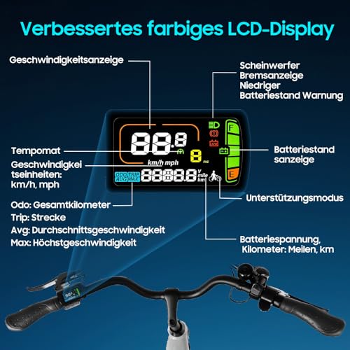 Der 250W bürstenlose Motor sorgt für eine kraftvolle Unterstützung beim Fahren. Mit einem maximalen Drehmoment von 60 Nm und einer Höchstgeschwindigkeit von 25 km/h kommst du mühelos voran. Du kannst zwischen drei verschiedenen Fahrmodi wählen: Tretunterstützung, reiner Elektromodus und manuelles Fahren. So passt du das Fahrerlebnis optimal an deine Bedürfnisse und das Gelände an. Das 7-Gang-Schaltsystem trägt zusätzlich zu einem komfortablen und effizienten Fahrerlebnis bei.