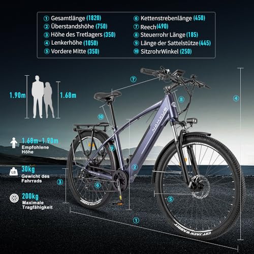 - Das E-Bike ist für Fahrer mit einer Körpergröße zwischen 1,65 m und 1,95 m geeignet.