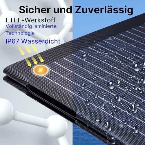 Das Solarpanel ist mit einer Schicht aus ETFE-Polymer laminiert, wodurch es wasserfest nach IP67-Standard ist. Dies macht es widerstandsfähig gegen äußere Einflüsse und verlängert die Lebensdauer des Solarmoduls. Beachte bitte, dass der Ständer zur Aufstellung des Solarpanels nicht im Lieferumfang enthalten ist und separat erworben werden muss.