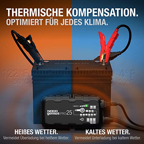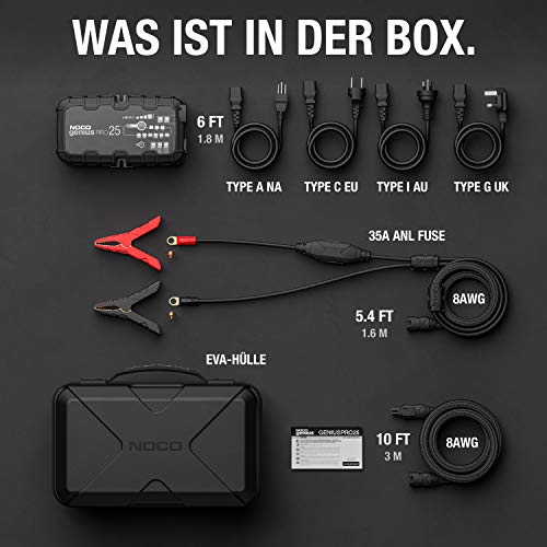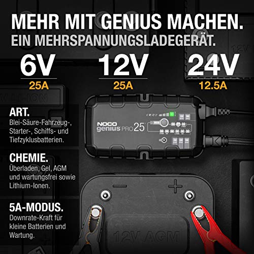 Fragen und Antworten zu NOCO GENIUSPRO25: 25A 6V/12V/24V Profi-Batterieladegerät – Intelligenter Erhaltungslader, Entsulfator & Netzteil mit Überladeschutz & Temperaturkompensation – Für Blei- & Lithiumbatterien