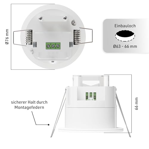 Bitte beachte, dass der Oktaplex Noa Präsenzmelder für die Parallelschaltung geeignet ist, jedoch nicht für Kreuz- und Wechselschaltungen. Die Maße des Präsenzmelders betragen Ø 76 x 66mm, der Einbaudurchmesser liegt zwischen 63 und 66mm.