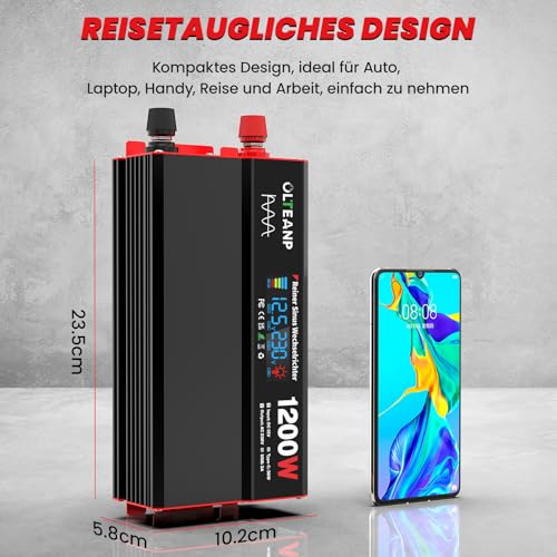 Der OLTEANP Wechselrichter wandelt 12V Gleichstrom in 230V Wechselstrom um und bietet dir eine zuverlässige Stromversorgungslösung für unterwegs oder zu Hause. Mit seiner Leistung von 1200W (bis zu 2400W Spitzenleistung) und den verschiedenen Anschlussmöglichkeiten, darunter USB und Typ-C, bist du für viele Situationen gerüstet. Ein integrierter LCD-Bildschirm informiert dich dabei über den Betriebszustand.