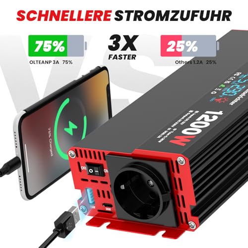Fragen und Antworten zu OLTEANP Wechselrichter 12V auf 230V Reiner Sinus,Spannungswandler 1200W Inverter mit LCD-Bildschirmanzeige, AC-Steckdosen, 36W Typ-C-Anschluss, 5V/3A USB-Anschluss für LKW,Zuhause,Fahrzeuge