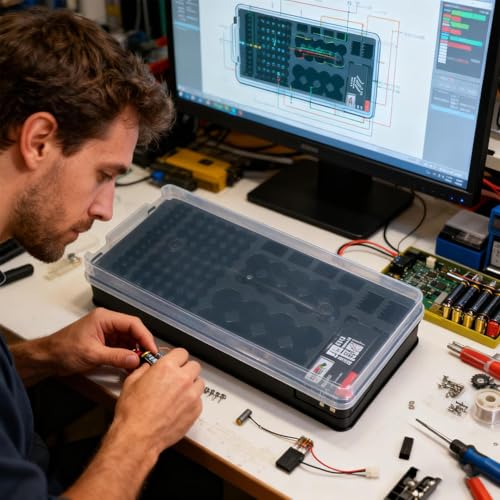 Die Integration von Batteriezubehör und sicherer Speicherung ermöglicht es dir, deine Werkzeuge und Komponenten jederzeit griffbereit zu haben, während sie gleichzeitig geschützt sind. Die verbesserte Workflow-Effizienz durch Organisation und einfacheren Zugang reduziert Arbeitsunterbrechungen. Die robuste Konstruktion des Batteriehalters erleichtert die Handhabung und sorgt für eine effiziente Lagerung. Ob für Kameras, Taschenlampen oder Hörgeräte, dieser Organizer ist vielseitig einsetzbar und unterstützt das Batteriemanagement für eine breite Palette von Geräten.