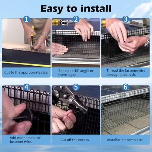Für eine einfache und sichere Montage werden 100 Edelstahlverschlüsse und 50 Kabelbinder mitgeliefert. Du benötigst also kein zusätzliches Material für die Installation. Der Vogeldraht für Solarmodule lässt sich leicht unter den Modulen oder sogar in Ecken anbringen. Wähle einfach die passende Größe und starte dein DIY-Projekt. Das Critter Shield hat eine Maschenweite von 1/2 Zoll, die ideal ist, um Tiere fernzuhalten, aber gleichzeitig Wind und Wasser durchlässt. Die soliden Schweißnähte sorgen für zusätzliche Stabilität.