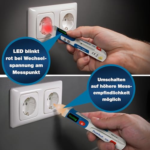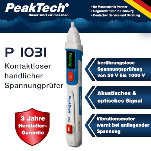 Fragen und Antworten zu PeakTech P 1031 – Kontaktloser AC Spannungsprüfer mit LED Signal Lampe & Vibration, 50-1000 V AC Betriebsbereich, Berührungsloser Spannungstester, Strom Prüfgerät, Stift Multimeter, 155 x 25mm, White